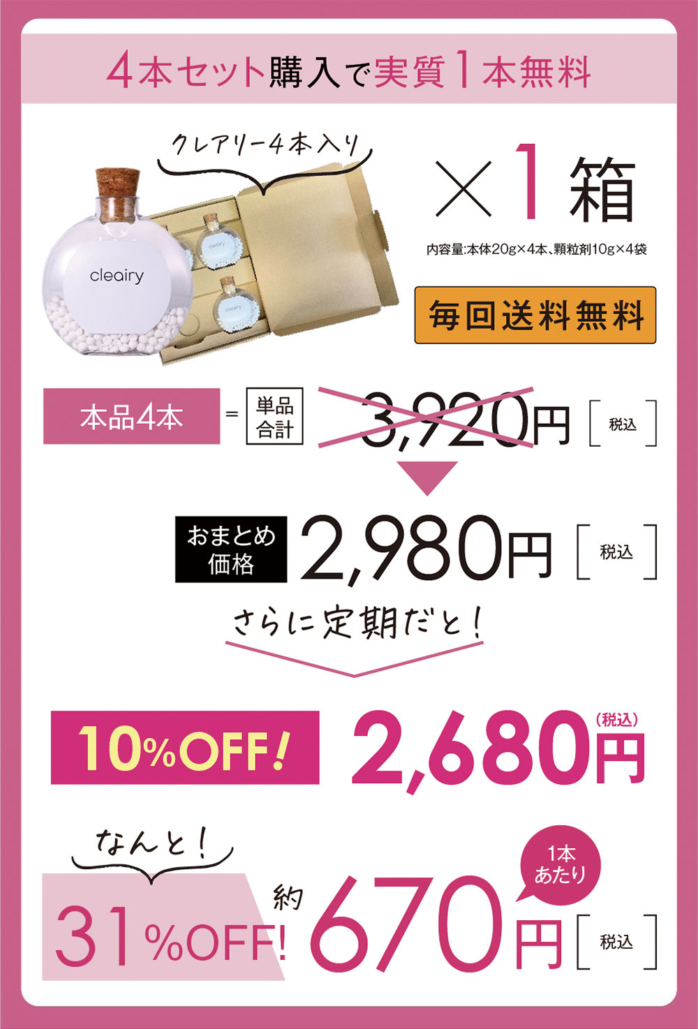初回引渡時期:申込から 10日以内にお届け、2回目以降は前回のお届け時期から約30日後にお届けします。毎回商品1箱(4本)お届けで2,680円 (税込)となります。(例えば、1回で解約された場合は総額2,680円(税込)、2回で解約された場合は総額5,360円(税込)、となります。)